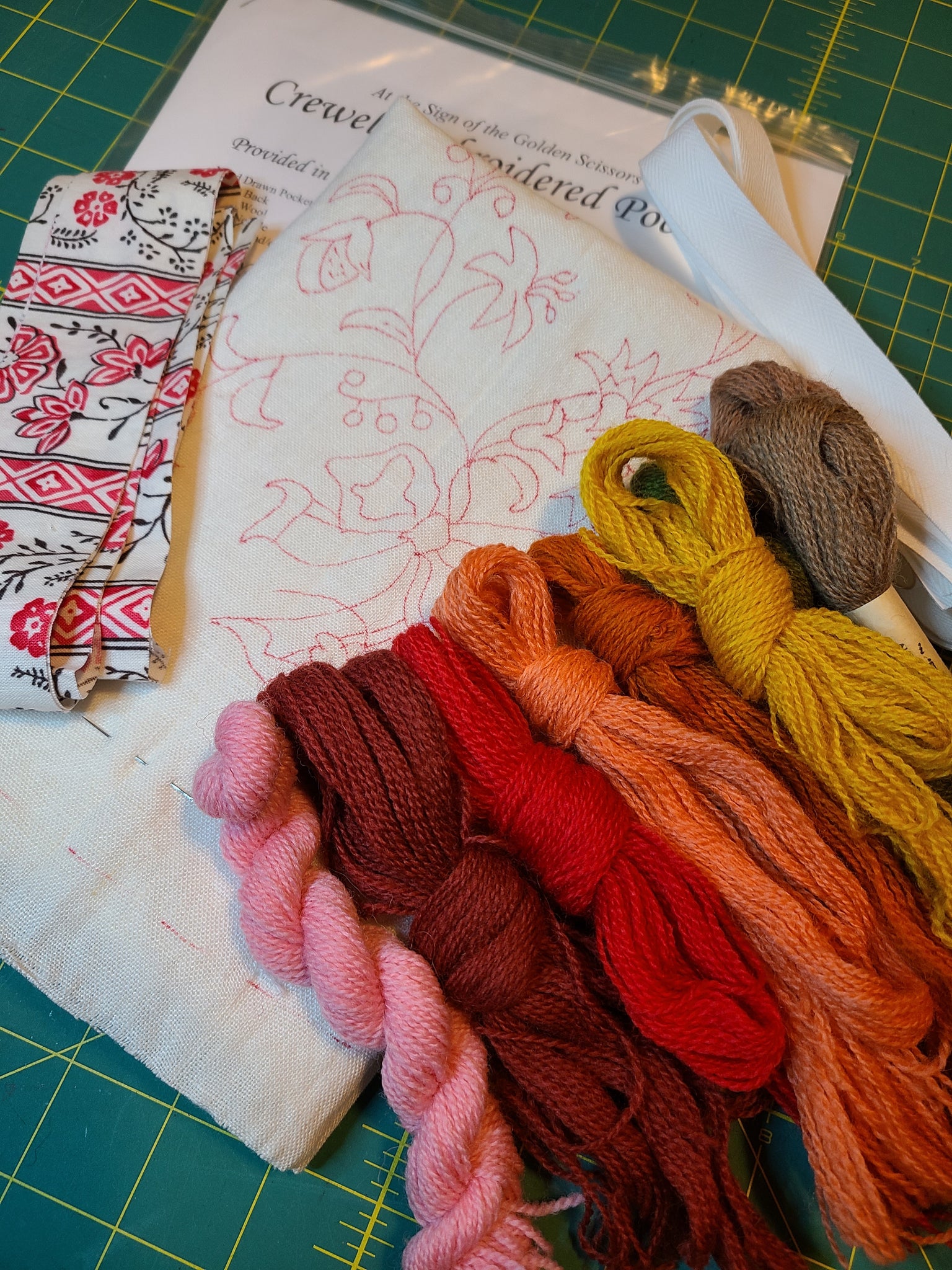 Kits include; crewel wool embroidery yarn, needle, linen fabric for front and back of pocket, linen tape or fabric for binding (depending on design), linen ties and instructions.